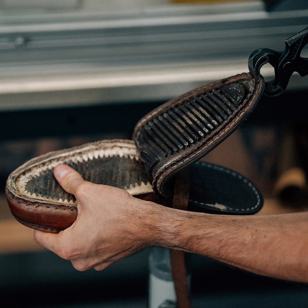 The worn sole is carefully removed, while respecting the integrity of the upper. This is a delicate stage, as the aim is to avoid damaging the components in good condition, so that they can be preserved: insert, welt, mounting plate or mounting wall.